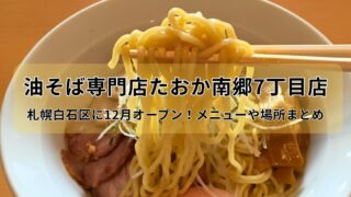 開店・閉店油そば専門店たおか南郷7丁目店|札幌白石区に12月オープン!メニューや場所まとめ 札幌・白石区に「油そば専門店たおか 南郷7丁目店」が新登場!駅チカでアクセス抜群。オープン日や住所、駐車場、メニュー情報をまとめました。 2025.11.10開店・閉店