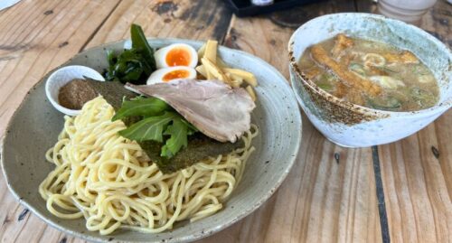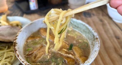 つけ汁はガツンと塩味が効いた濃いめの魚介醤油ですが、別添えの魚粉を溶かし込むとカドが取れて、マイルドで食べやすい味わいに変化します!